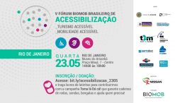 O V Fórum Brasileiro Biomob de Acessibilização vai acontecer no próximo dia 23, quarta-feira, das 14 às 18h, no Museu do Amanhã, no Rio de Janeiro. Para participar basta se inscrever, basta acessar www.bit.ly/acessibilizacao_2305. Os inscritos são convidados a doar lacres de latinhas para a campanha Toma lá Dá Cá, que doa cadeiras de rodas, sondas, bengalas e ajuda quem precisa.