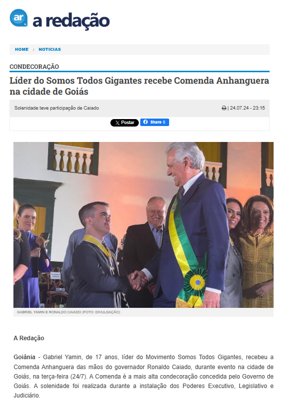 Líder do Somos Todos Gigantes recebe Comenda Anhanguera na cidade de Goiás