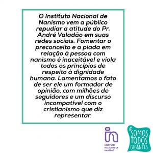 O Instituto Nacional de Nanismo (INN) vem a público repudiar a publicação do pastor André Valadão envolvendo pessoas com nanismo por meio de sua conta pessoal do Instagram na quinta-feira (12). O vídeo, já curtido por mais de 150 mil pessoas é, infelizmente, um tipo comum de bullying sofrido diariamente por adultos e crianças. O termo ‘anão’ foi utilizado pejorativamente e a indicação é que a referência seja feita a ‘pessoas com nanismo’.