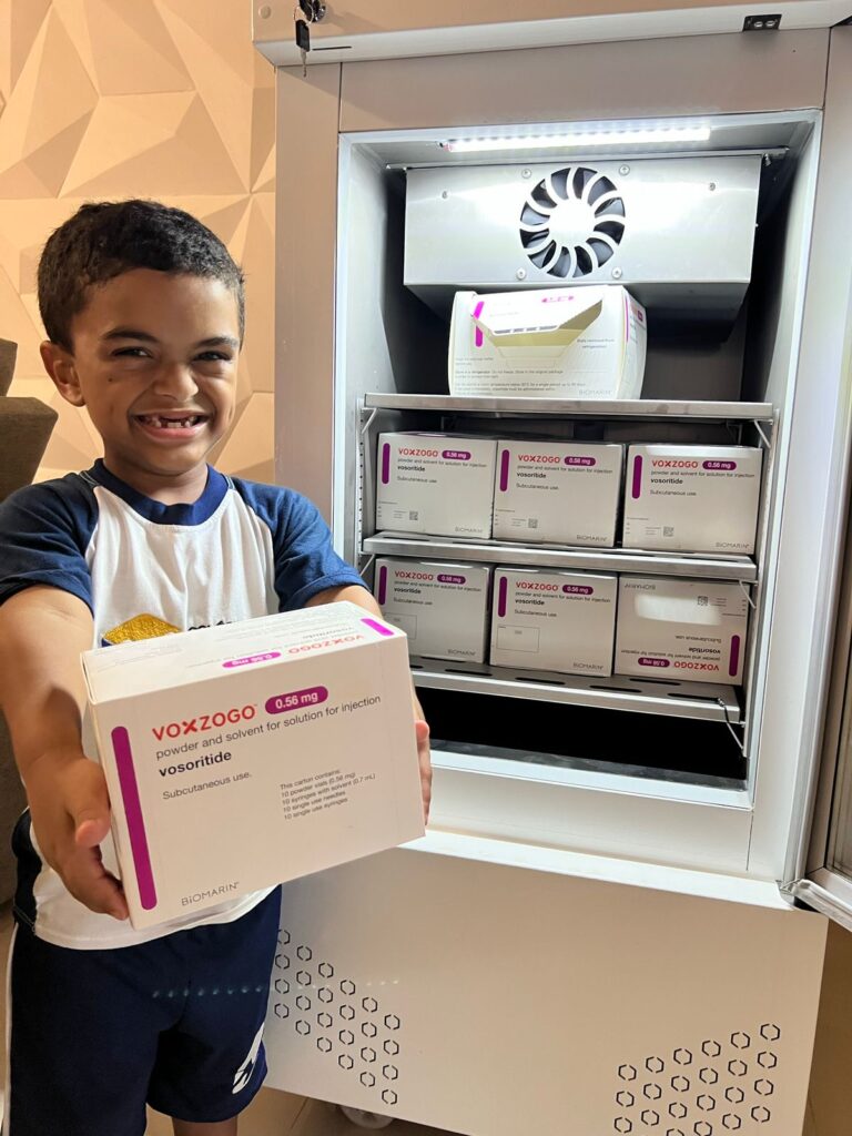 Liberado pela Anvisa em novembro de 2021, o Voxzogo é um medicamento para crianças e adolescentes com acondroplasia, o tipo mais comum de nanismo. Desde setembro de 2023, a Agência Nacional de Vigilância Sanitária (Anvisa) alterou a bula do medicamento e liberou o uso para bebês a partir de 6 meses até o fechamento das placas de crescimento. O remédio foi aplicado pela primeira vez no Brasil no início de 2022 e estimula o crescimento, além de diminuir as complicações causadas pela deficiência.